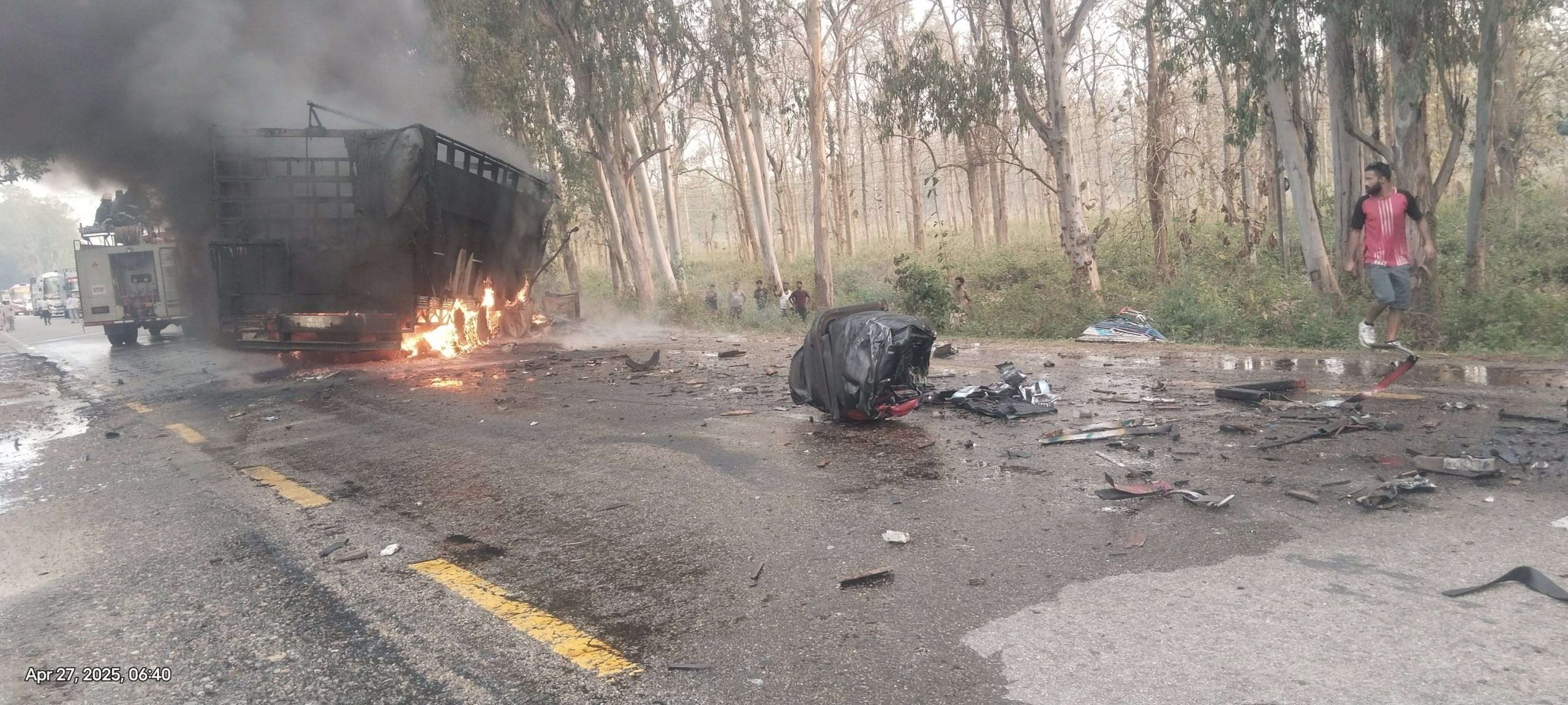 पूर्व–पश्चिम राजमार्गमा आइतबार विहान ६ बजे पूर्वतर्फ गईरहेको प्र.०२.०३.००१ख ०७१५ नम्बरको ट्रक बिपरीत दिशाबाट आइरहेको ना६ख ३४६३ नम्बरको ट्रकसंग ठोक्किएको हो ।