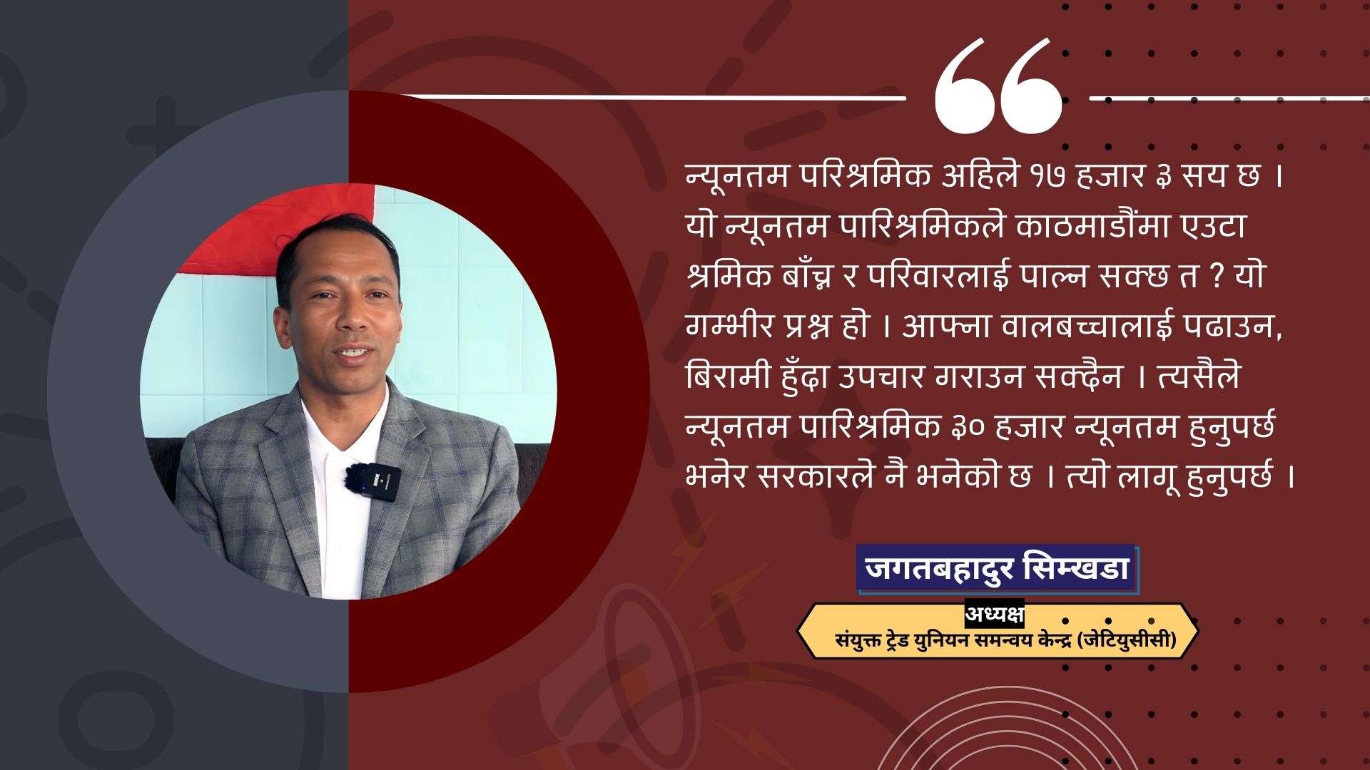 न्यूनतम परिश्रमिक अहिले १७ हजार ३ सय छ । यो न्यूनतम पारिश्रमिकले काठमाडौंमा एउटा श्रमिक बाँच्न र परिवारलाई पाल्न सक्छ त ? यो गम्भीर प्रश्न हो । आफ्ना वालबच्चालाई पढाउन, बिरामी हुँदा उपचार गराउन सक्दैन । त्यसैले न्यूनतम पारिश्रमिक ३० हजार न्यूनतम हुनुपर्छ भनेर सरकारले नै भनेको छ । त्यो लागू हुनुपर्छ ।