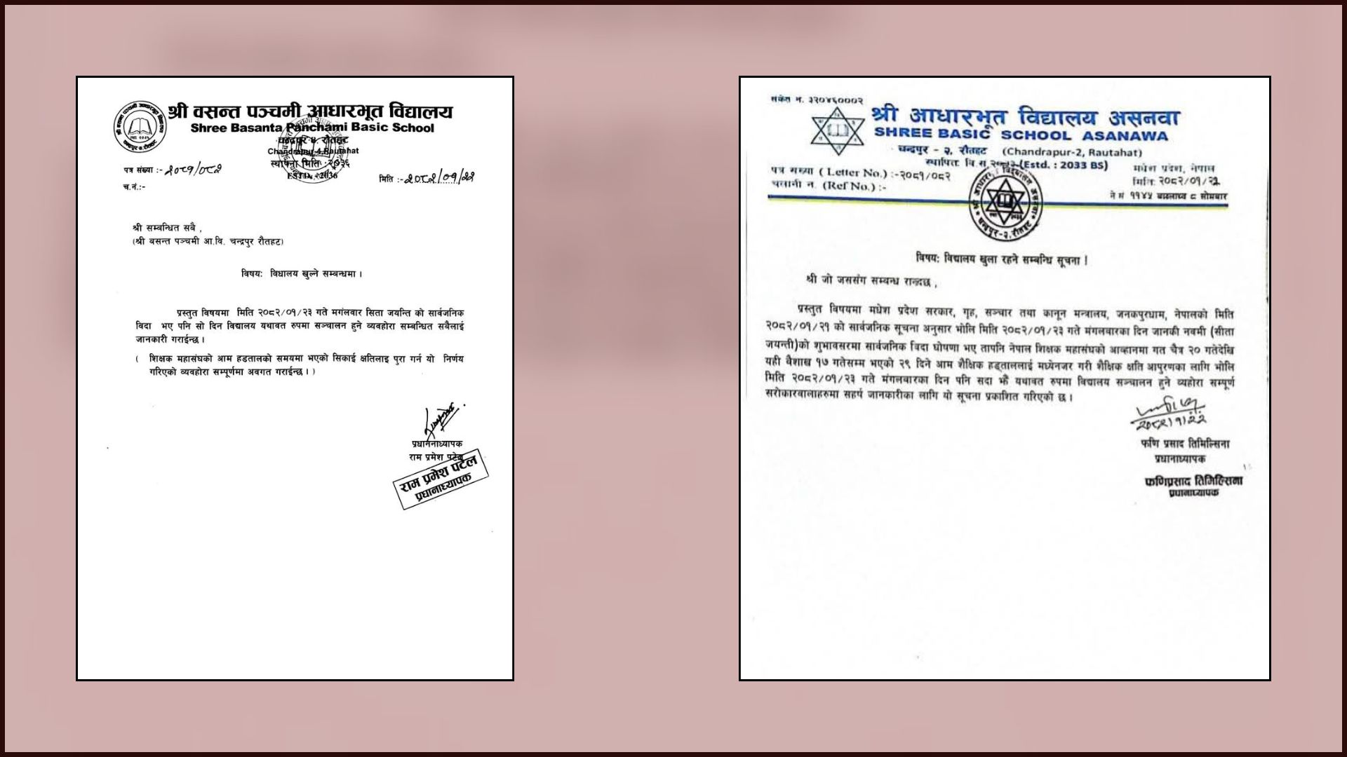 श्री वसन्त पञ्चमी आधारभूत विद्यालय चन्द्रपुर ४ र श्री आधारभूत विद्यालय असनवा चन्द्रपुर २ ले बिदाको दिनपनि पढाउने भएका हुन ।