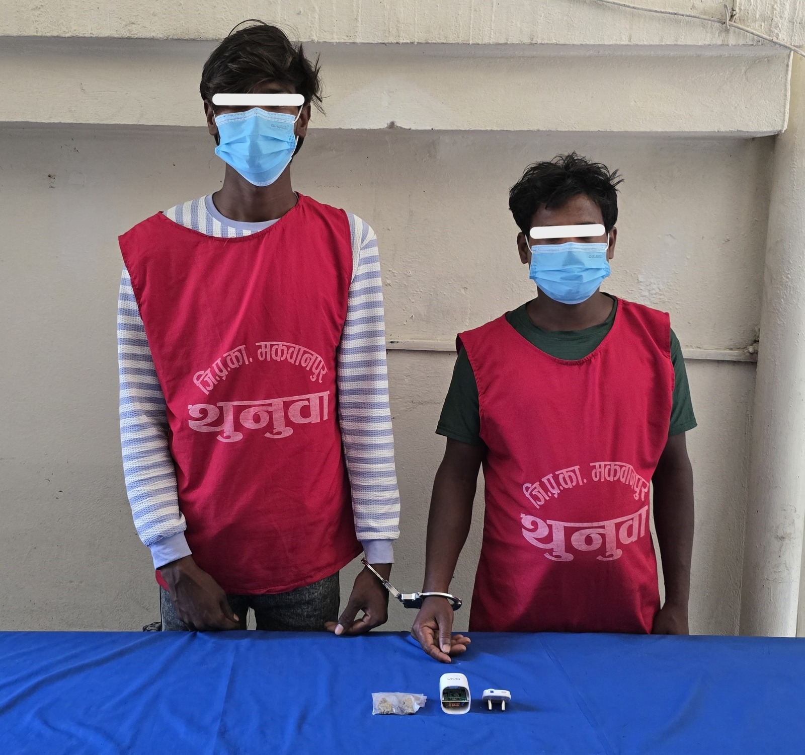 बुधबार दिउँसो ३ बजेको समयमा प्रहरी टोलीले हेटौँडा–१५, रातोमाटेमा सुरक्षाजाँच गर्ने क्रममा पर्सा जिल्लाको बीरगन्ज महानगरपालिका–५ का २० वर्षीय करण राय र २९ वर्षीय उपेन्द्र रायभरलाई लागूऔषध खैरो हेरोइन १८ ग्राम १५० मिलिग्रामसहित पक्राउ गरेको जिल्ला प्रहरी कार्यालय मकवानपुरले जनाएको छ ।