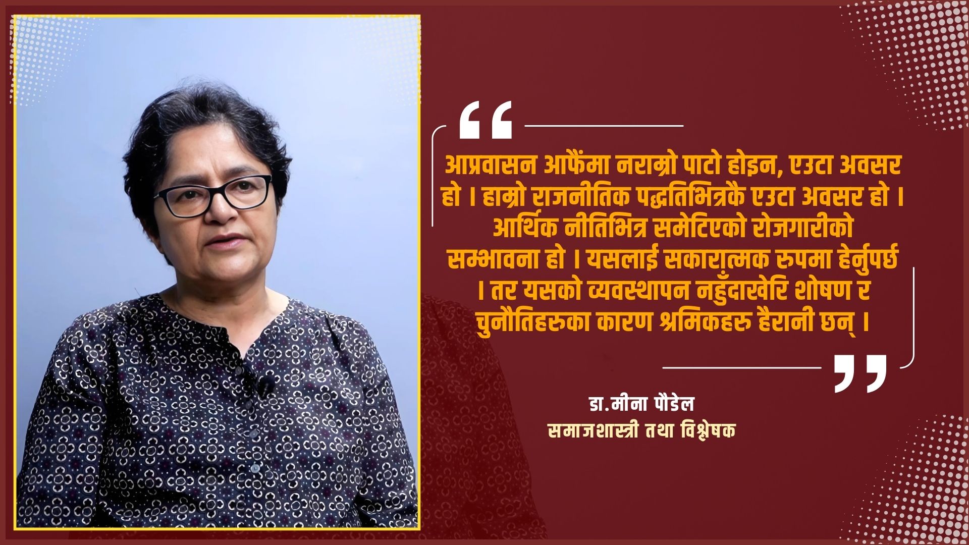 डा. पौडेलको भनाइमा आप्रवासन आफैंमा नकारात्मक होइन । यो रोजगारीको एउटा अवसर हो, जसले राजनीतिक र आर्थिक नीति दुवैलाई सहयोग पुर्याइरहेको छ । तर, ‘व्यवस्थापनको अभावले यसलाई शोषणको स्रोत बनाएको छ,’ उनी भन्छिन् ।
