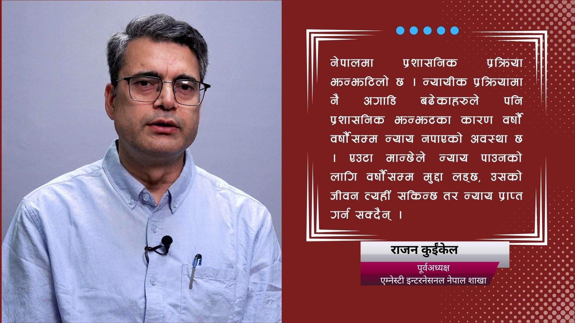 नेपालमा प्रशासनिक प्रक्रिया झन्झटिलो र न्याय मंहगो छ ः राजन कुईंकेल मानव अधिकारको अवस्थालाई दक्षिण एसियासँग तुलना गरेर हेर्ने हो भने नेपाल तुलनात्मक रुपमा खुकुलो मान्न सकिएला । तर नेपालभित्रको मानव अधिकारको विषयको कुरा गर्ने हो भने थुप्रै विषयहरू यस्ता छन्, जुन लामो समयदेखि त्यसमा प्रगती हुन सकेका छैनन् । १० वर्षे सशस्त्र द्वन्द्वको समयमा पीडित भएका मानिसलाई न्याय दिनको लागि राज्यले गरेको प्रतिबद्धता दशकौं भइसक्यो तर पूरा गर्न सकिरहेका छैनौ । सरकारले भर्खरै तेस्रो सत्य निरुपण तथा मेलमिलाप आयोग र वेपत्ता छानबिन आयोग बनाएको छ । तर त्यो आयोग पीडितहरुको सल्लाह, सहमति र उनीहरुलाई न्युनतम संलग्न समेत गराइएन भन्ने एकदमै ठूलो गुनासो छ ।
