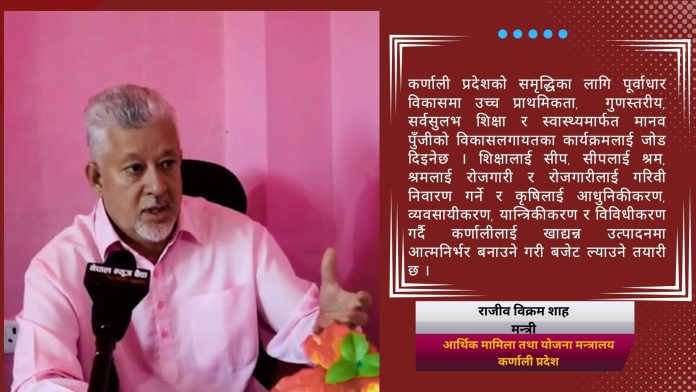 कर्णाली प्रदेशको समृद्धिका लागि पूर्वाधार विकासमा उच्च प्राथमिकता, गुणस्तरीय, सर्वसुलभ शिक्षा र स्वास्थ्यमार्फत मानव पुँजीको विकासलगायतका कार्यक्रमलाई जोड दिइनेछ । शिक्षालाई सीप, सीपलाई श्रम, श्रमलाई रोजगारी र रोजगारीलाई गरिवी निवारण गर्ने र कृषिलाई आधुनिकीकरण, व्यवसायीकरण, यान्त्रिकीकरण र विविधीकरण गर्दै कर्णालीलाई खाद्यन्न उत्पादनमा आत्मनिर्भर बनाउने गरी बजेट ल्याउने तयारी छ ।