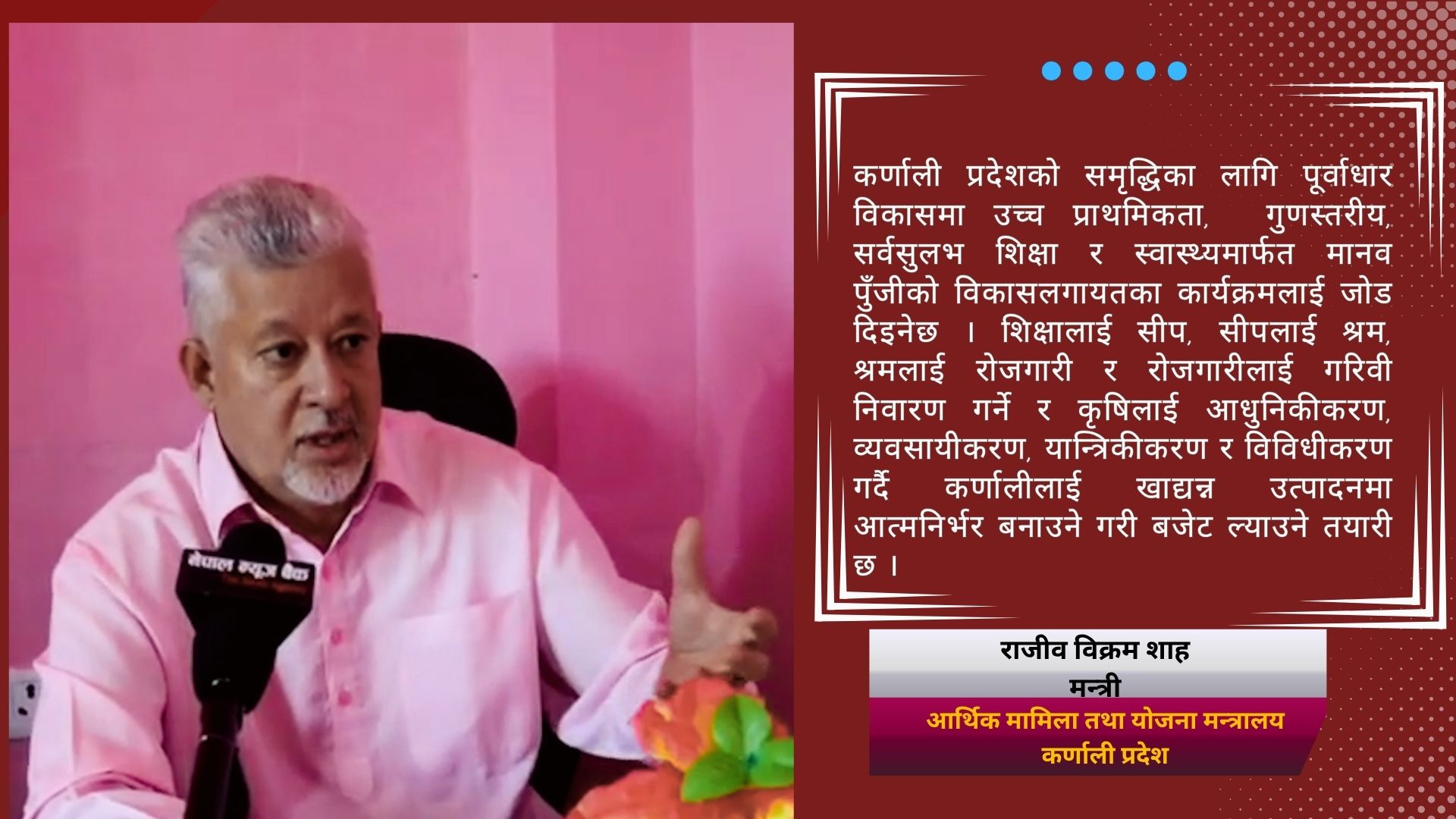 सुर्खेत । कर्णाली प्रदेश सरकारका आर्थिक मामिला तथा योजना मन्त्री राजीव बिक्रम शाहले कर्णालीको सामाजिक, आर्थिक, भौतिक र मानवीय विकासमा केन्द्रित बजेट ल्याउने बताएका छन् । कर्णालीको भौतिक बिकास तथा विभिन्न सम्भावनाहरुको पहिचान गरी त्यसको माध्यमबाट आर्थिक बिकास गर्न सक्ने गरी बजेट ल्याउने उनको भनाई छ । प्रदेशको समृद्धिका लागि पूर्वाधार बिकासमा उच्च प्राथमिकता, गुणस्तरीय, सर्वसुलभ शिक्षा र स्वास्थ्यमार्फत मानव पुँजीको बिकासलगायतका कार्यक्रमलाई जोड दिइने उनले बताए । शिक्षालाई सीप, सीपलाई श्रम, श्रमलाई रोजगारी र रोजगारीलाई गरिवी निवारण गर्ने र कृषिलाई आधुनिकीकरण, व्यवसायीकरण, यान्त्रिकीकरण र विविधीकरण गर्दै कर्णालीलाई आद्यान्न उत्पादनमा आत्मनिर्भर बनाउने गरी बजेट ल्याउने उनले बताए । पाँच हेक्टरमा भन्दा बढी जमिनमा कृषि व्यवसाय गर्ने व्यवसायीलाई कर्जामा ब्याज अनुदान दिने र दुई हेक्टरभन्दा बढी जमिनमा कृषि व्यवसाय र फलफूल खेती गर्ने सहकारी, फर्म, कम्पनी, कृषक समूहलाई लागत सहभागिताको आधारमा अनुदानको व्यवस्था गरिने खाद्यान्न, स्याउ ओखर तथा सुन्तला विकास कार्यक्रमलाई बिशेष कार्यक्रमका रुपमा सञ्चालन गर्ने, एक गाउँ एक व्यवसायिक फलफूल खेती बगैचा कार्यक्रमलाई जोड दिइने उनको भनाइ छ । चौरी, च्याङ्ग्रा, बाख्रा, दुध, मह, अदुवा, बेसार लगायत कृषि बस्तुको अत्पादनमा आधारित प्रोत्साहन अनुदान कार्यक्रम, हुम्ला र डोल्पामा चौरी, दैलेखमा बाख्रा, जाजरकोटमा मौरीर सल्यानमा सुन्तला जातका फलफूल बिकास फर्म केन्द्रको स्थापनाका लागि अध्ययन गर्ने, दैलेख, जाजरकोट र सल्यान लगायतका जिल्लाहरुमा उच्चपहाडको स्याउ तथा ओखर बगैचा सुदृढीकरण कार्यक्रमका लागि बजेट विनियोजन गरिने उनको भनाइ छ ।
