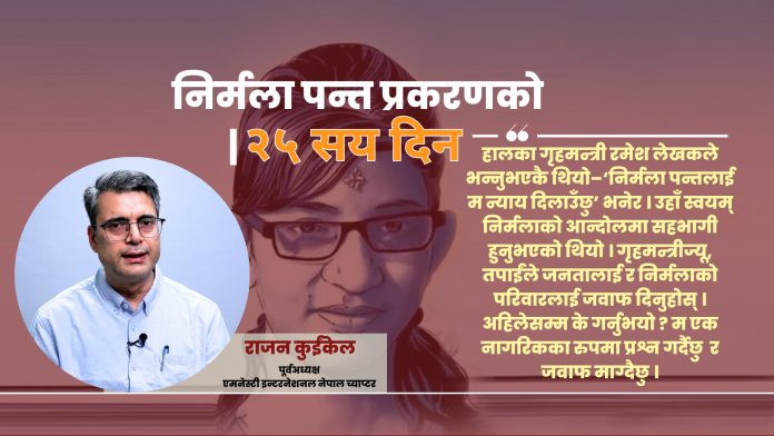 हालका गृहमन्त्री रमेश लेखकले भन्नुभएकै थियो–‘निर्मला पन्तलाई म न्याय दिलाउँछु’ भनेर । उहाँ स्वयम् निर्मलाको आन्दोलमा सहभागी हुनुभएको थियो । गृहमन्त्रीज्यू, तपाईंले जनतालाई र निर्मलाको परिवारलाई जवाफ दिनुहोस् । अहिलेसम्म के गर्नुभयो ? म एक नागरिकका रुपमा प्रश्न गर्दैछु र जवाफ माग्दैछु ।