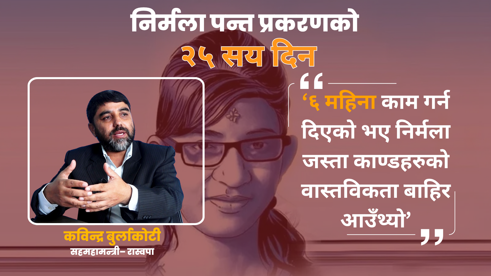 निर्मला पन्तको वलात्कार पछिको हत्याको सम्बन्धमा प्रहरीले हेरिराखेको केस हो । रवि लामिछाने जुनबेला गृहमन्त्री हुनुहुन्थ्यो त्यसबेला उहाँले हत्याकाण्डदेखि लिएर अरु थुप्रै कुराहरु मुख्य प्राथमिकतामा राखेर काम गर्नेगरि तयारी गर्नु भएको थियो । उहाँले ठूला ठूला भ्रष्टाचारका काण्डहरु खोल्नेदेखि लिएर एक प्रकारको ‘सिंगम स्टाइल’मा काम गर्नको लागि प्रयास सुरु गर्नु भएको थियो । तर त्यो कसैलाई मन परेन वा रुचेन । ठूला नेताहरु जेल जाने अवस्था आयो । सरकार नै ढालेर रवि लामिछानेलाई बाहिर ल्याउने मात्रै नभइ थुनामा पठाउने अवस्था ल्याइदिए ।