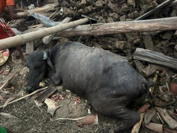 बागमती नगरपालिका–३, जिरायतमा व्यावसायिक रुपमा भैँसी पालन गर्दै आएका रामप्रताप रायको खपडाले छाएको गोठ बुधबार बिहानीपखको हावाहुरीले भत्किँदा त्यसभित्र च्यापिएर दुई वटा भैँसी मरेका हुन् ।