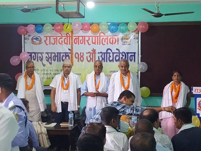 रौतहट असार ०६ गते , रौतहट जिल्लाको राजदेवी नगरपालिकाले आफ्नो १४ औ नगर सभा अधिवेशन सुरु गरेको छ । राजदेवी नगरपालिकाका नगर प्रमुख भिखारी प्रसाद यादवको अध्यक्षतामा सुरु भएको नगर सभा अधिवेशन नगरपालिकाको सभाहलमा नै सुरु भएको छ । पालिकाको १४ औ नगर सभा अधिवेशनका प्रमुख अतिथिका रुपमा जिल्ला समन्वय समिति रौतहटका सभापती राम अयोध्या राय यादव उपस्थित भएका हुन । कार्यक्रममा नगर सभाको १४ औ अधिवेशनमा पालिकाका प्रमुख प्रशासकिय अधिकृत प्रल्व कायस्त सचिवका रुपमा आशन ग्रहण गर्नु भएको छ । नगर सभा अधिवेशन कार्यक्रममा राजदेवि नगरपालिकाका वडा नम्बर १ देखि वडा नम्बर ९ सम्मका सम्पुर्ण वडा अध्यक्ष र वडा सदस्यहरुको उपस्थिती रहेको छ भने उलेख्निय मात्रा स्थानिय जनसमुदायहरुको सहभागिता रहेको छ । पालिकाको १४ नगर सभा अधिवेशन कार्यक्रम सञ्चारकर्मी , सुरक्षाकर्मी , नगर प्रहरीको उपस्तिथिमा सुरु भएको छ । अधिवेशन बाट आज प्रस्तुत हुने अगामी नीति कार्यक्रम तथा बजेट पालिकाका जनताहरुको माग , अहिलेको आवश्यकता लाई सम्बोधन गर्छ्न भने उपस्थित जनसमुदायको अपेक्षा रहेको छ ।।