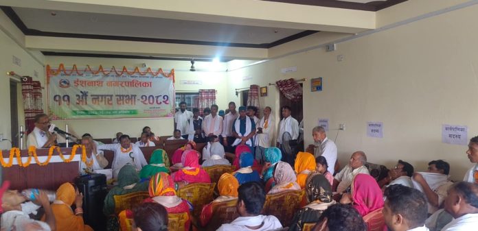 रौतहट , असार ७ गते , इशनाथ नगरपालिकाको ११ औ नगर सभा अधिविशन भव्यताको साथ सम्पन्न भएको छ । नगरपालिकाको आफ्नै सभा हलमा भएको ११ औ नगर सभा अधिवेशन विधिवत रुपमा पानसमा बत्ती बाली नगरपालिकाका नगर प्रमुख कौशलया देवि , प्रमुख अतिथी डाक्टर रामस्वरुप सिंह , नगर उप प्रमुख प्रवेज आलम , प्रमुख प्रशासकिय अधिकृत नन्दकिशोर गुप्ताले संयुक्त रुपमा उदघाटन गरेका थिए । कार्यक्रम उदघाटन पछि नगरपालिकाका प्रमुख प्रशासकिय अधिकृत नन्दकिशोर गुप्ता स्वागत मन्तव्य राख्दै कार्यक्रमा उपस्थित सम्पुर्णलाई स्वागत गरेका थिए । नगरपालिकाका नगर प्रमुख कौशलया देविको अध्यक्षतामा सुरु भएको ११ औ नगर सभा अधिवेशनमा पुर्व शिक्षा सचिव डा रामस्वरुप सिंह प्रमुख अतिथिका रुपमा उपस्थित भएका थिए । नगरपालिकाको ११ औ नगर सभा अधिवेशनमा पालिकाका उप प्रमुख प्रवेज आलम , पालिका प्रमुख प्रसाशकिय अधिकृत नन्दकिशोर गुप्ता विशिष्ट अतिथिका रुपामा आशन ग्रहन गरेका थिए । अगामी आर्थिक वर्ष ८२र८३ लागि नीति कार्यक्रम प्रस्तुत गर्दै नगर प्रमुख कौशलया देविले पालिका भित्रका कृषक , पशुपालक तथा जनतालाई लक्षित गरि नीति कार्यक्रम प्रस्तुत गरेका थिइन । त्यस्तै अगामी आर्थिक वर्ष ८२र८३ का लागी अनुमानित बजेट प्रस्तुत गर्दै नगरपालिकाका नगर उप प्रमुख प्रवेज आलमले ४९ करोड्क ६५ लाख ५२ हजार ४ सय ९७ रुपैयाको बजेट प्रस्तुत गरेका थिए । ११ औ नगर सभा अधिवेशमा नगरपालिकाका वडा नम्बर १ देखि वडा नम्बर ९ सम्मका सम्पुर्ण वडा अध्यक्ष वडा सदस्य तथा कार्यपालिका सदस्यहरुको सहभागिता रहेको थियो । अगामी आर्थिक वर्ष ८२र८३ को नीति कार्यक्रम तथा अनुमानित बजेट वक्तव्यमा पालिकाका जनसमुदाय , समाजसेवी लगायत अगुवाहरुको उल्लेखनिय सहभागि भएका थिए । कार्यक्रमा सञ्चारकर्मी , सुरक्षाकर्मी लगायतको समेत सहभागिता रहेको पालिकाका लेखा शाखा प्रमुख मनोज ठाकुरले बताएका हुन ।