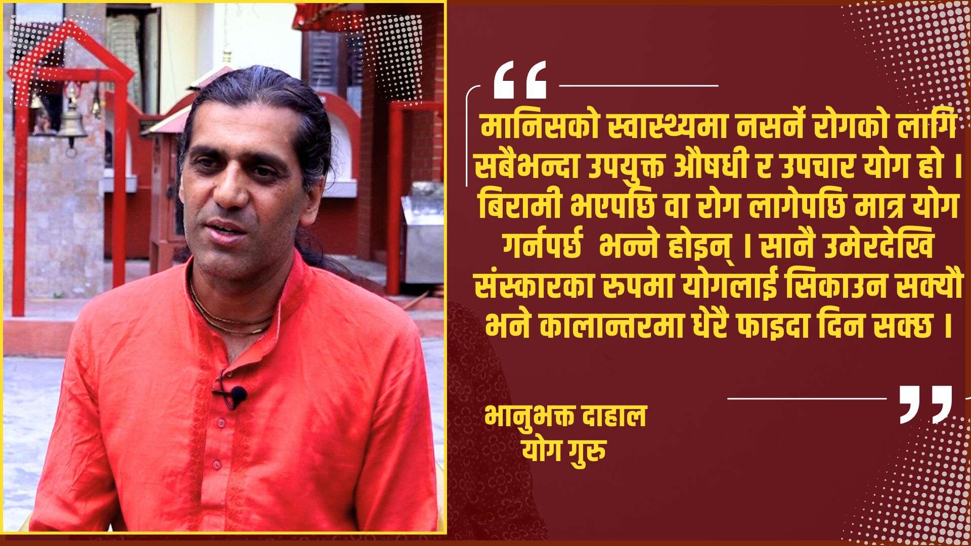 योग गुरु भानुभक्त दाहालले मानिसको स्वास्थ्यमा नसर्ने रोगको लागि सबैभन्दा उपयुक्त औषधी र उपचार योग भएको उल्लेख गरेका छन् । उनका अनुसार योगले शरीरको प्रणालीहरुलाई ठिक बनाउनका साथै रोगसँग लड्न सक्ने क्षमता बढाउने काम गर्छ ।