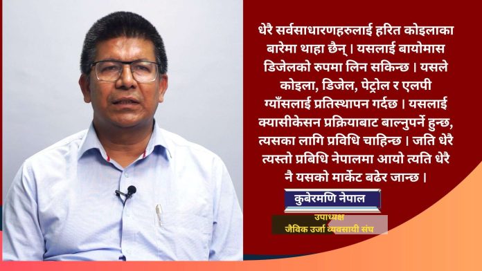 हरित कोइलाबारे नेपालीलाई बुझाउन जरुरी छ कुबेरमणि नेपाल उर्जा उद्यमी हुन् । जैविक उर्जा व्यवसायी संघ उपाध्यक्ष एव रिडी पावर कम्पनीको अध्यक्ष हुन् । उनले नेपालमा हरित कोइला उत्पादन गरिरहेका छन् । बकस रेन्युएबल इनर्जी कम्पनी लिमिटेड स्थापना गरेर विदेशबाट आउने पत्थर कोइलालाई विस्थापित गर्नेगरी बनजंगलको झारपात सदुपयोग गर्दै हरित कोइला उत्पादन गरिरहेको छ । हरित कोइलाको महत्वबारे नेपाल न्यूज बैंकले नेपालसँग कुराकानी गरेको छ ।